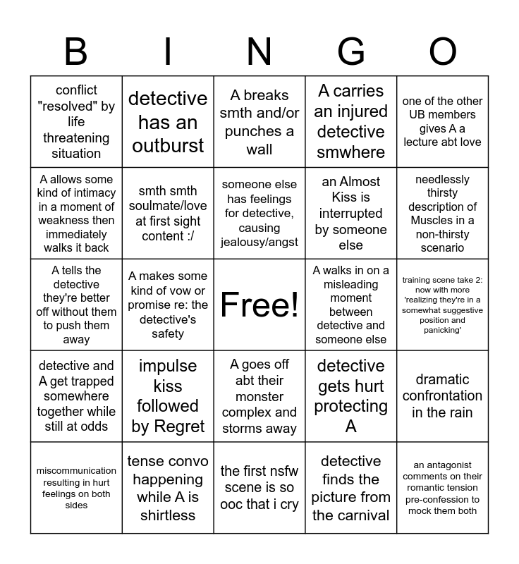 This bingo card has a free space and 24 words: impulse kiss followed by Regret, tense convo happening while A is shirtless, someone else has feelings for detective, causing jealousy/angst, miscommunication resulting in hurt feelings on both sides, one of the other UB members gives A a lecture abt love, conflict "resolved" by life threatening situation, A allows some kind of intimacy in a moment of weakness then immediately walks it back, detective has an outburst, A walks in on a misleading moment between detective and someone else, A goes off abt their monster complex and storms away, an Almost Kiss is interrupted by someone else, A tells the detective they're better off without them to push them away, detective gets hurt protecting A, dramatic confrontation in the rain, smth smth soulmate/love at first sight content :/, detective finds the picture from the carnival, training scene take 2: now with more 'realizing they're in a somewhat suggestive position and panicking', A breaks smth and/or punches a wall, needlessly thirsty description of Muscles in a non-thirsty scenario, A makes some kind of vow or promise re: the detective's safety, an antagonist comments on their romantic tension pre-confession to mock them both, detective and A get trapped somewhere together while still at odds, A carries an injured detective smwhere and the first nsfw scene is so ooc that i cry.