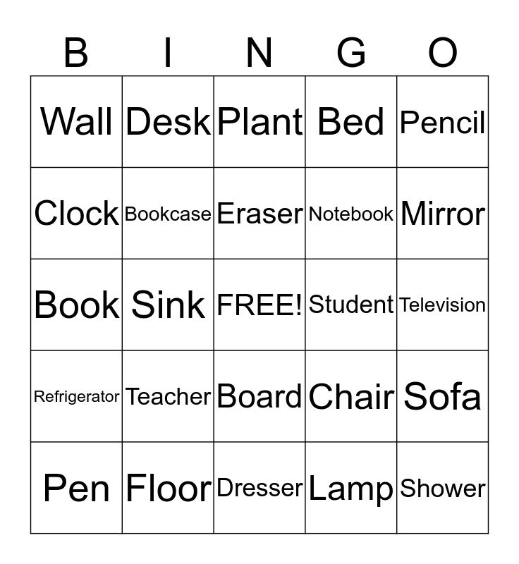 This bingo card has a free space and 24 words: Teacher, Floor, Eraser, Pen, Pencil, Wall, Clock, Desk, Student, Board, Notebook, Book, Chair, Sofa, Bookcase, Lamp, Television, Plant, Mirror, Sink, Shower, Refrigerator, Bed and Dresser.