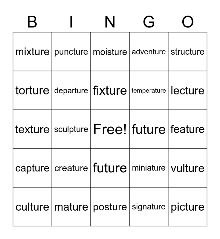 This bingo card has a free space and 26 words: future, signature, fixture, mature, structure, mixture, torture, puncture, feature, miniature, temperature, texture, vulture, culture, sculpture, pasture, adventure, capture, moisture, picture, lecture, posture, future, creature, departure and premature.