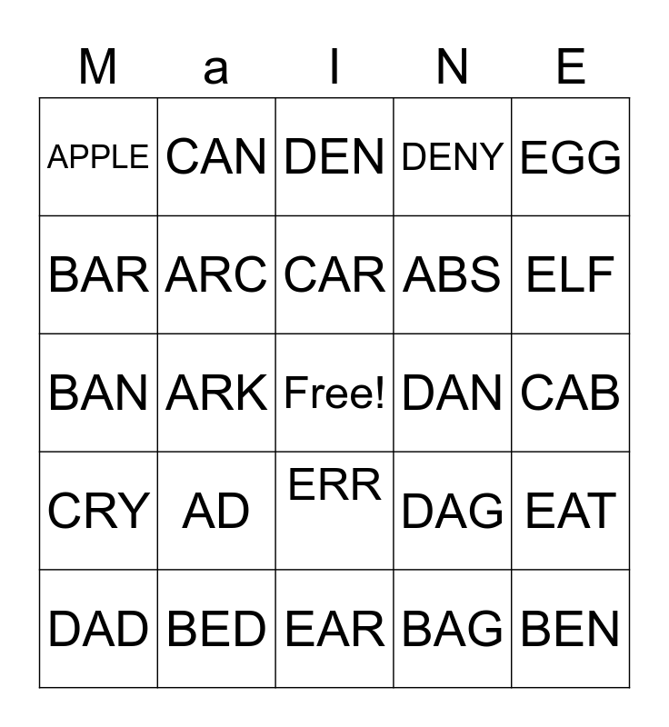 This bingo card has a free space and 24 words: AD, BED, CAR, DAD, EGG, APPLE, BAR, CAN, DAN, ERR, ABS, BAN, DAG, EAT, ARC, BAG, CAB, DEN, ELF, ARK, BEN, CRY, DENY and EAR.
