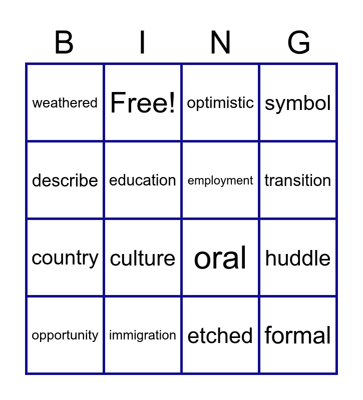 This bingo card has 19 words: oral, hazy, optimistic, formal, huddle, describe, etched, weathered, Free!, country, culture, education, employment, immigration, opportunity, refuge, symbol, transition and translate.