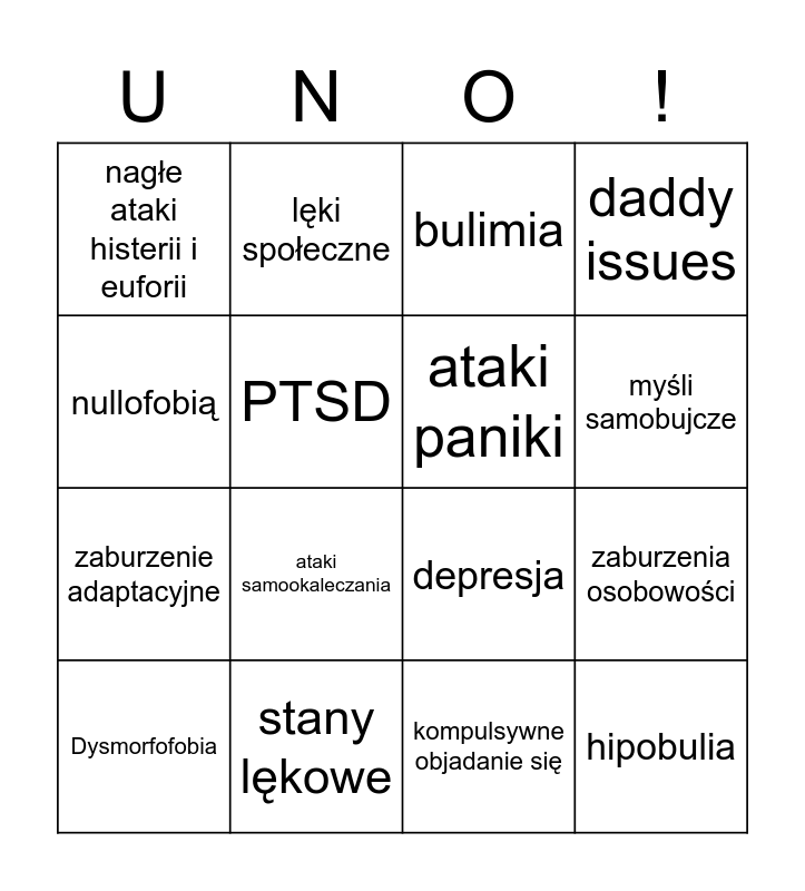 This bingo card has 16 words: stany lękowe, zaburzenia osobowości, bulimia, nagłe ataki histerii i euforii, zaburzenie adaptacyjne, lęki społeczne, depresja, kompulsywne objadanie się, nullofobią, PTSD, Dysmorfofobia, daddy issues, ataki samookaleczania, myśli samobujcze, ataki paniki and hipobulia.