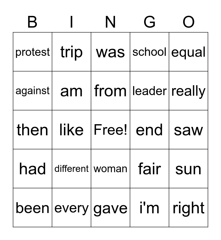 This bingo card has a free space and 29 words: been, law, like, our, protest, was, am, different, end, every, saw, right, gave, i'm, really, story, woman, had, equal, then, fair, better, leader, against, school, trip, sun, from and fun.