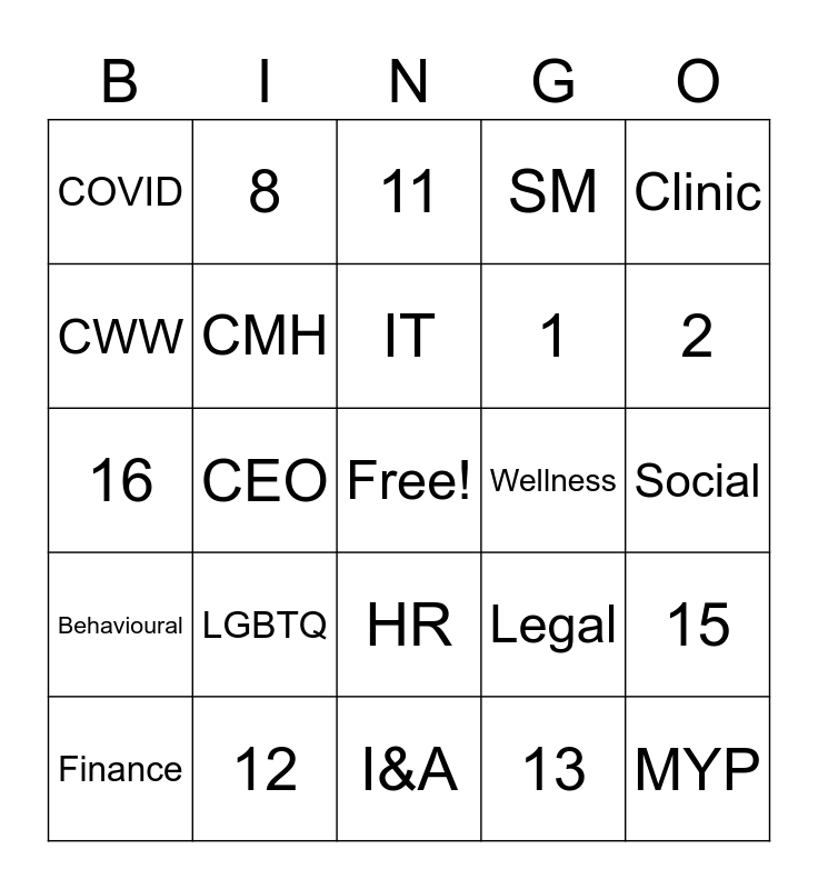 This bingo card has a free space and 39 words: Access, FWB, AMH, CMH, Finance, HR, IT, AC, Clinic, Behavioural, CEO, SM, MYP, Social, Wellness, LGBTQ, Task Force, COVID, Admin, Legal, CWW, I&A, 1, 2, 3, 4, 5, 6, 7, 8, 9, 10, 11, 12, 13, 14, 15, 16 and 17.