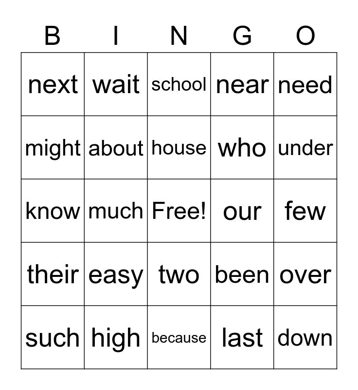 This bingo card has a free space and 24 words: easy, high, house, such, need, next, might, wait, our, two, who, know, been, over, about, last, few, school, under, much, down, their, near and because.
