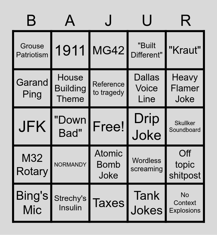 This bingo card has a free space and 24 words: NORMANDY, Strechy's Insulin, Reference to tragedy, Bing's Mic, "Kraut", Grouse Patriotism, Garand Ping, 1911, Drip Joke, Atomic Bomb Joke, Dallas Voice Line, JFK, Wordless screaming, Off topic shitpost, House Building Theme, Tank Jokes, Skullker Soundboard, MG42, Heavy Flamer Joke, "Down Bad", No Context Explosions, M32 Rotary, "Built Different" and Taxes.