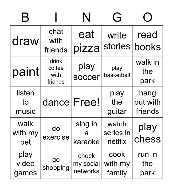 This bingo card has a free space and 24 words: do exercise, go shopping, play soccer, play video games, read books, draw, paint, chat with friends, play the guitar, sing in a karaoke, play basketball, listen to music, watch series in netflix, play chess, drink coffee with friends, cook with my family, hang out with friends, eat pizza, walk in the park, dance, run in the park, walk with my pet, write stories and check my social networks.