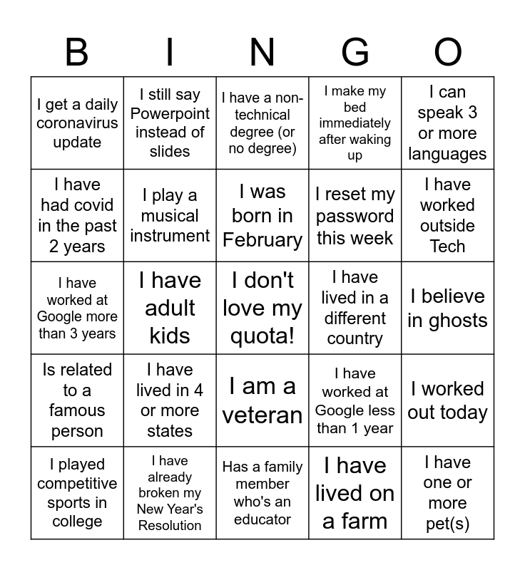 This bingo card has a free space and 24 words: I have lived in 4 or more states, I have already broken my New Year's Resolution, I was born in February, I played competitive sports in college, I can speak 3 or more languages, I get a daily coronavirus update, I have had covid in the past 2 years, I still say Powerpoint instead of slides, I have lived in a different country, I am a veteran, I reset my password this week, I have worked at Google more than 3 years, I have worked at Google less than 1 year, I worked out today, I play a musical instrument, I have lived on a farm, I believe in ghosts, I have a non-technical degree (or no degree), I have worked outside Tech, I have adult kids, I have one or more pet(s), Is related to a famous person, I make my bed immediately after waking up and Has a family member who's an educator.