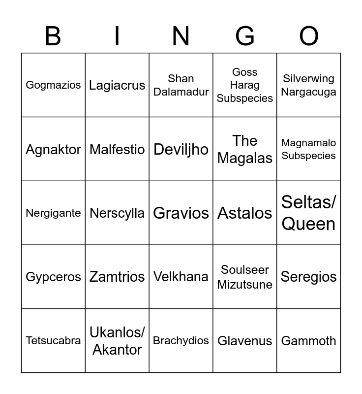 This bingo card has a free space and 24 words: Zamtrios, Ukanlos/ Akantor, Deviljho, Tetsucabra, Silverwing Nargacuga, Gogmazios, Agnaktor, Lagiacrus, Astalos, Velkhana, The Magalas, Nergigante, Soulseer Mizutsune, Seregios, Malfestio, Glavenus, Seltas/ Queen, Shan Dalamadur, Magnamalo Subspecies, Nerscylla, Gammoth, Gypceros, Goss Harag Subspecies and Brachydios.