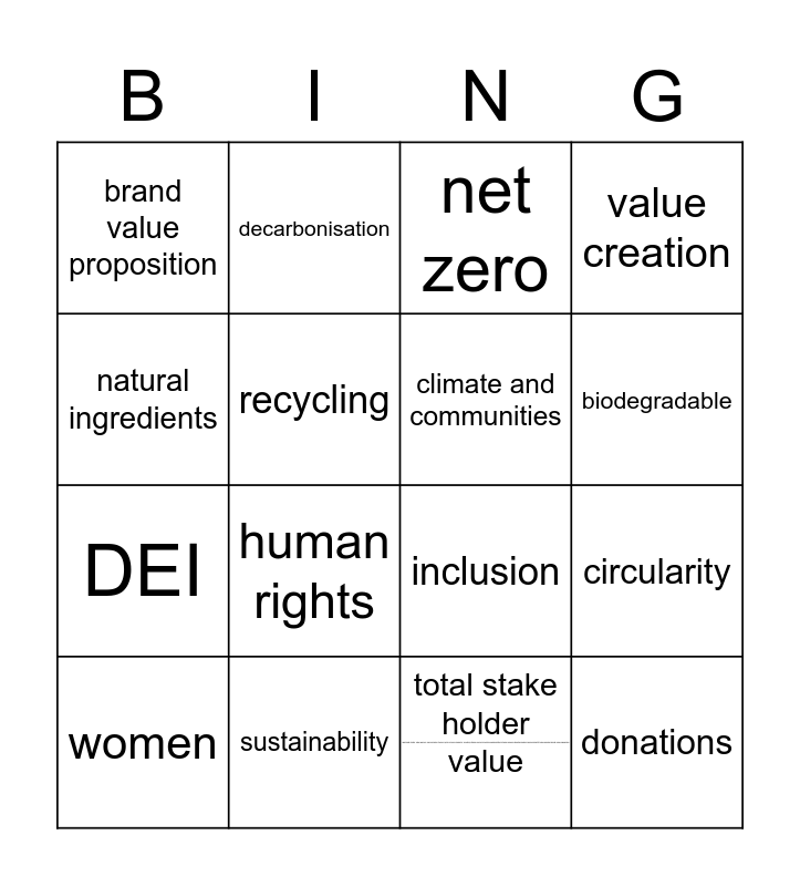 This bingo card has 1 images and 17 words: total stake holder value, women, net zero, brand value proposition, human rights, value creation, circularity, climate and communities, biodegradable, recycling, sustainability, inclusion, natural ingredients, decarbonisation, DEI, value creation and donations.