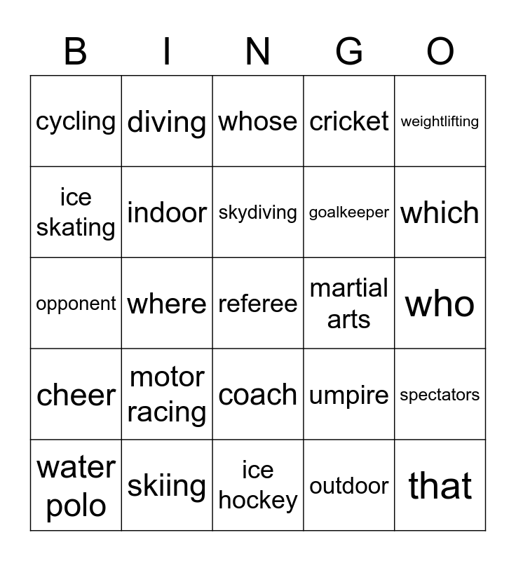 This bingo card has a free space and 24 words: motor racing, skiing, skydiving, water polo, weightlifting, cycling, ice skating, diving, martial arts, coach, goalkeeper, opponent, umpire, spectators, indoor, outdoor, who, whose, which, where, that, cheer, cricket and ice hockey.