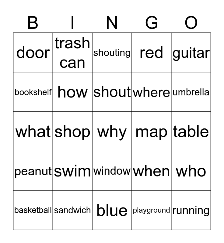 This bingo card has a free space and 24 words: swim, sandwich, shout, basketball, guitar, door, bookshelf, trash can, map, window, where, what, when, who, how, playground, table, shouting, umbrella, shop, running, peanut, red and blue.