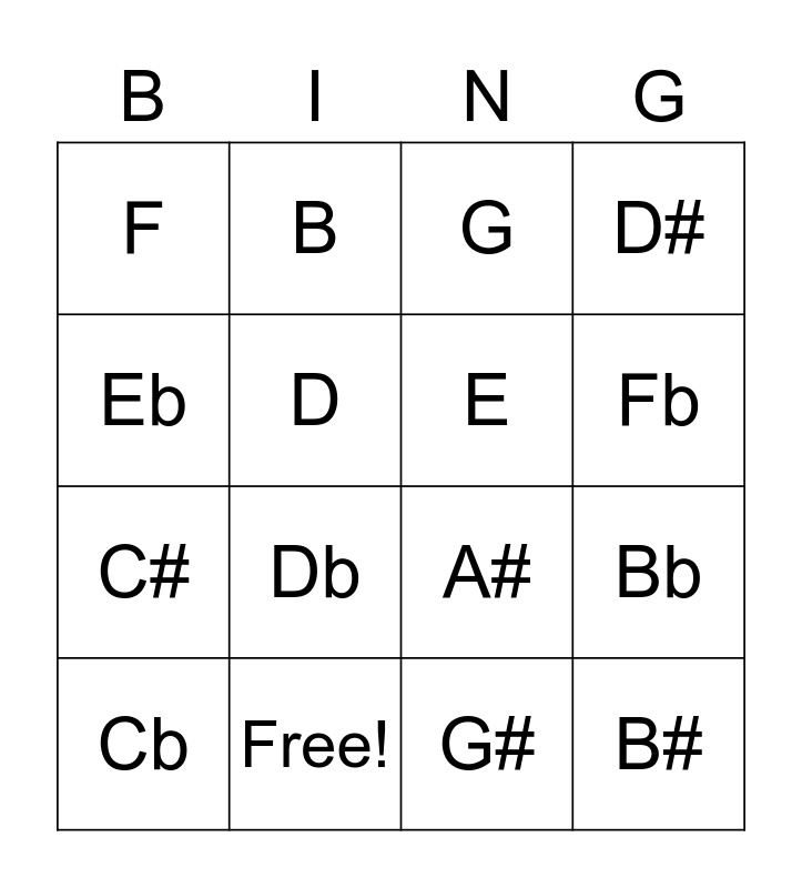This bingo card has 22 words: Free!, A, B, C, D, E, F, G, A#, B#, C#, D#, E#, F#, G#, Ab, Bb, Cb, Db, Eb, Fb and Gb.