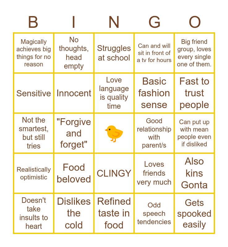 This bingo card has a free space and 24 words: Food beloved, Dislikes the cold, Love language is quality time, Doesn't take insults to heart, Big friend group, loves every single one of them., Magically achieves big things for no reason, Sensitive, No thoughts, head empty, Good relationship with parent/s, CLINGY, Basic fashion sense, Not the smartest, but still tries, Loves friends very much, Also kins Gonta, Innocent, Odd speech tendencies, Can put up with mean people even if disliked, Struggles at school, Fast to trust people, "Forgive and forget", Gets spooked easily, Realistically optimistic, Can and will sit in front of a tv for hours and Refined taste in food.