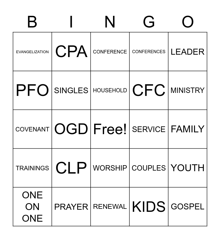 This bingo card has a free space and 24 words: CLP, PRAYER, HOUSEHOLD, ONE ON ONE, LEADER, EVANGELIZATION, PFO, CPA, SERVICE, WORSHIP, CFC, COVENANT, COUPLES, YOUTH, SINGLES, KIDS, FAMILY, CONFERENCE, MINISTRY, OGD, GOSPEL, TRAININGS, CONFERENCES and RENEWAL.