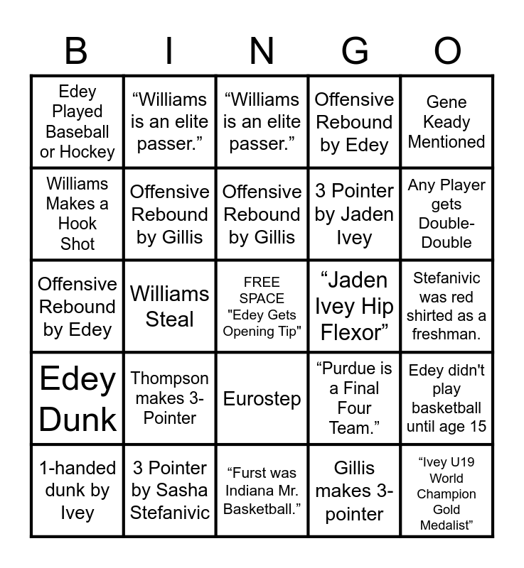 This bingo card has a free space and 27 words: “Purdue is a Final Four Team.”, “Two-headed Monster” (Edey and Williams), 3 Pointer by Jaden Ivey, “Furst was Indiana Mr. Basketball.”, Williams Makes a Hook Shot, “Williams is an elite passer.”, “Williams is an elite passer.”, Edey Dunk, “Jaden Ivey Hip Flexor”, Edey didn't play basketball until age 15, Offensive Rebound by Edey, Offensive Rebound by Edey, 1-handed dunk by Ivey, 3 Pointer by Sasha Stefanivic, Any Player gets Double-Double, 1-handed dunk by Ivey, Offensive Rebound by Gillis, Offensive Rebound by Gillis, Thompson makes 3-Pointer, Edey Played Baseball or Hockey, Stefanivic was red shirted as a freshman., Gillis makes 3-pointer, Williams Steal, “Ivey U19 World Champion Gold Medalist”, Eurostep, Gene Keady Mentioned and Alley-oop Dunk by Edey.