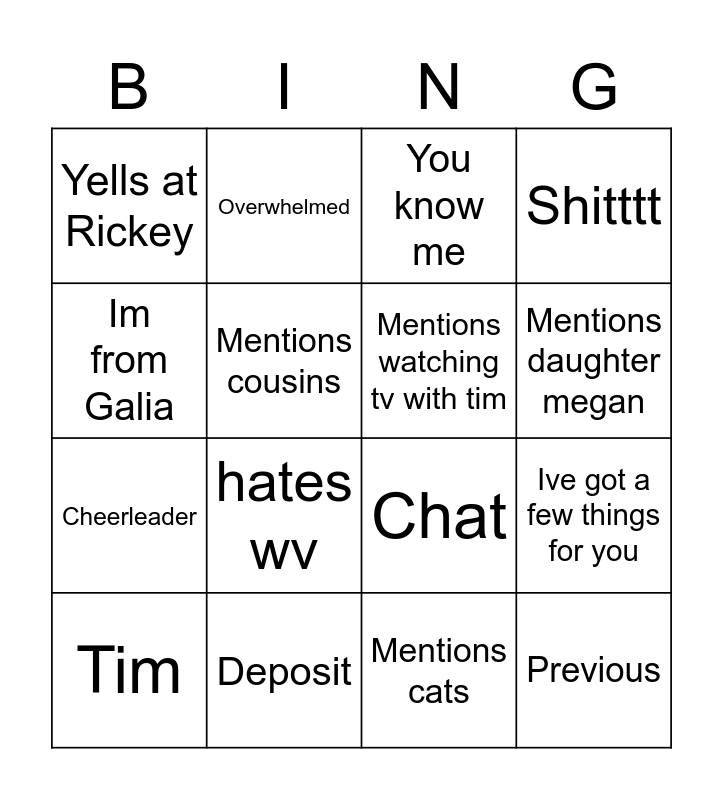 This bingo card has 16 words: Tim, Deposit, You know me, Shitttt, Im from Galia, Overwhelmed, Chat, Ive got a few things for you, Yells at Rickey, Mentions cousins, Mentions cats, Mentions daughter megan, Cheerleader, hates wv, Mentions watching tv with tim and Previous.