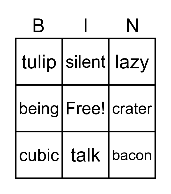 This bingo card has a free space and 8 words: crater, lazy, silent, cubic, tulip, bacon, being and talk.