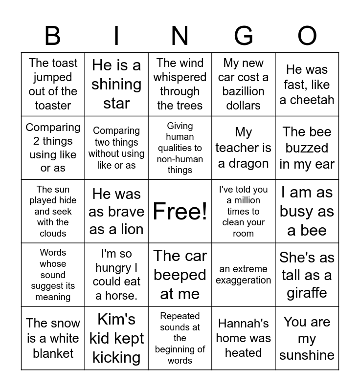 This bingo card has a free space and 24 words: I'm so hungry I could eat a horse., Kim's kid kept kicking, Giving human qualities to non-human things, The snow is a white blanket, He was fast, like a cheetah, The toast jumped out of the toaster, Comparing 2 things using like or as, He is a shining star, I've told you a million times to clean your room, The car beeped at me, My teacher is a dragon, The sun played hide and seek with the clouds, an extreme exaggeration, She's as tall as a giraffe, Comparing two things without using like or as, Hannah's home was heated, I am as busy as a bee, The wind whispered through the trees, The bee buzzed in my ear, He was as brave as a lion, You are my sunshine, Words whose sound suggest its meaning, My new car cost a bazillion dollars and Repeated sounds at the beginning of words.