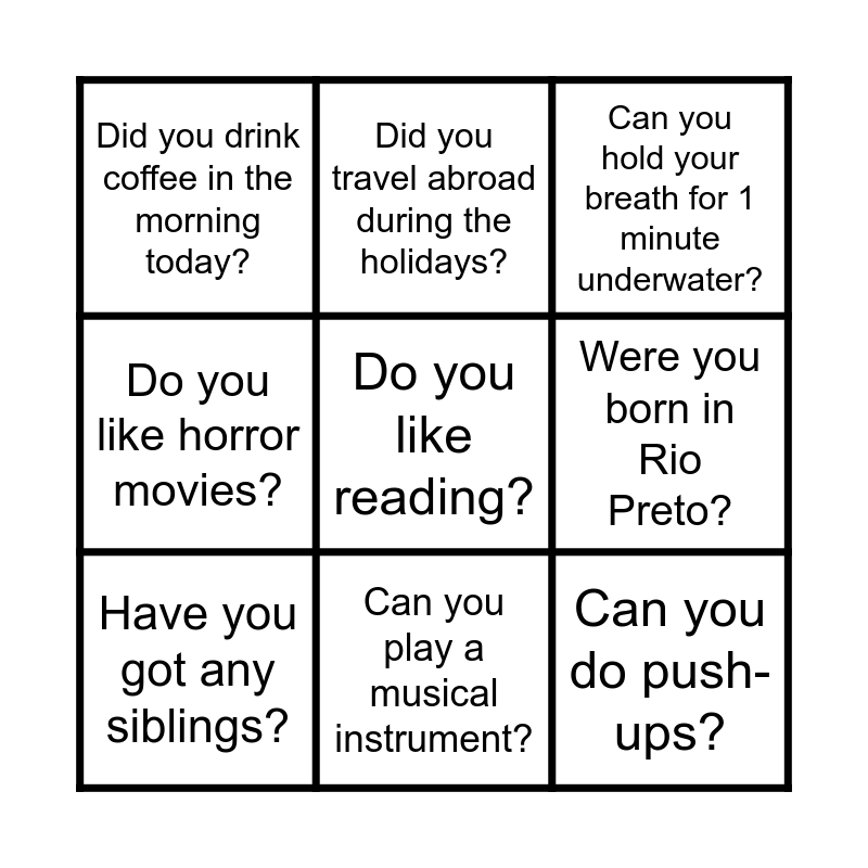 This bingo card has 9 words: Have you got any siblings?, Can you hold your breath for 1 minute underwater?, Did you travel abroad during the holidays?, Do you like horror movies?, Did you drink coffee in the morning today?, Were you born in Rio Preto?, Do you like reading?, Can you do push-ups? and Can you play a musical instrument?.