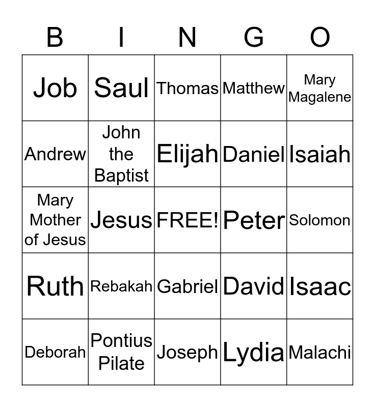 This bingo card has a free space and 24 words: Rebakah, Pontius Pilate, Elijah, Deborah, Mary Magalene, Job, Andrew, Saul, Peter, Gabriel, Daniel, Mary Mother of Jesus, David, Isaac, John the Baptist, Lydia, Solomon, Thomas, Isaiah, Jesus, Malachi, Ruth, Matthew and Joseph.