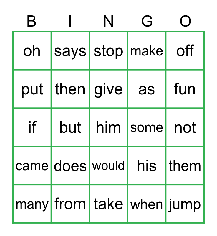 This bingo card has a free space and 24 words: does, from, give, many, off, oh, put, says, some, would, as, if, his, them, then, when, not, stop, fun, but, jump, came, make and take.