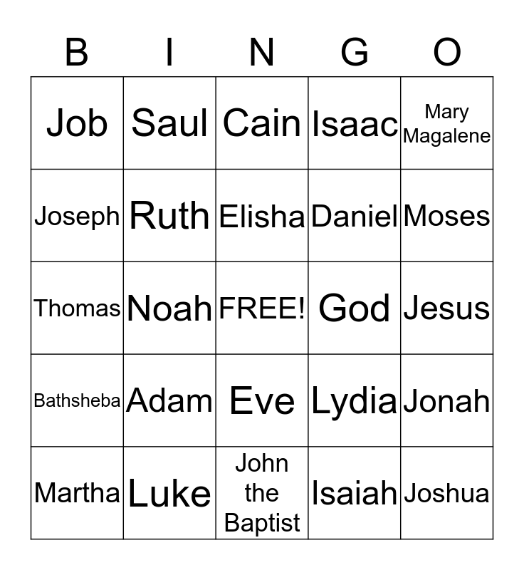 This bingo card has a free space and 24 words: Adam, Luke, Elisha, Martha, Mary Magalene, Job, Joseph, Saul, God, Eve, Daniel, Thomas, Lydia, Jonah, Ruth, Isaiah, Jesus, Cain, Moses, Noah, Joshua, Bathsheba, Isaac and John the Baptist.