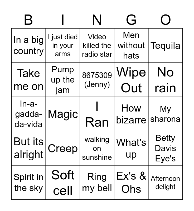 This bingo card has 44 words: Tainted love, I Ran, Follow me, Spirit in the sky, Closing time, Ex's & Ohs, Video killed the radio star, Wipe Out, Tequila, Soft cell, Men without hats, How bizarre, walking on sunshine, Creep, Ice Ice Baby, Ring my bell, Macarena, In-a-gadda-da-vida, Safety dance, No rain, I just died in your arms, Walking in Memphis, 96 tears, In a big country, Boys are back in town, My sharona, Hey, Can't touch this, What's up, But its alright, Sugar Sugar, Betty Davis Eye's, Me and mr jones, Hooked on a feeling, Magic, Play that funky music, The boys are back in town, Afternoon delight, 8675309 (Jenny), Take me on, Wipe Out, Ice Ice baby, Pump up the jam and Na-Na-Hey Hey.