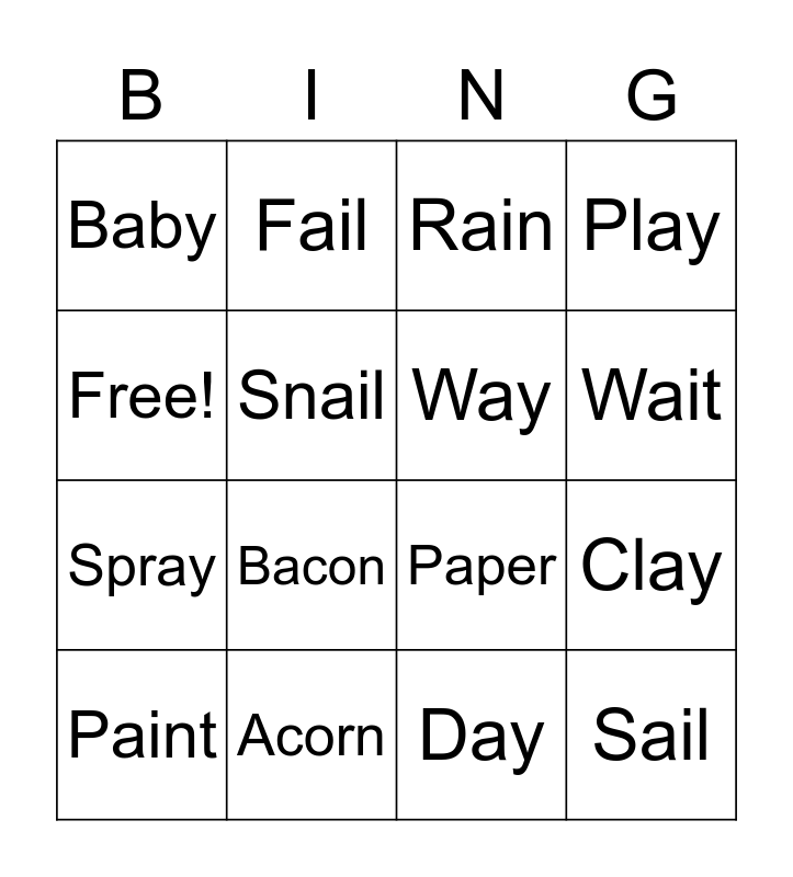 This bingo card has 16 words: Acorn, Clay, Rain, Baby, Spray, Fail, Paper, Day, Free!, Snail, Paint, Play, Bacon, Wait, Way and Sail.