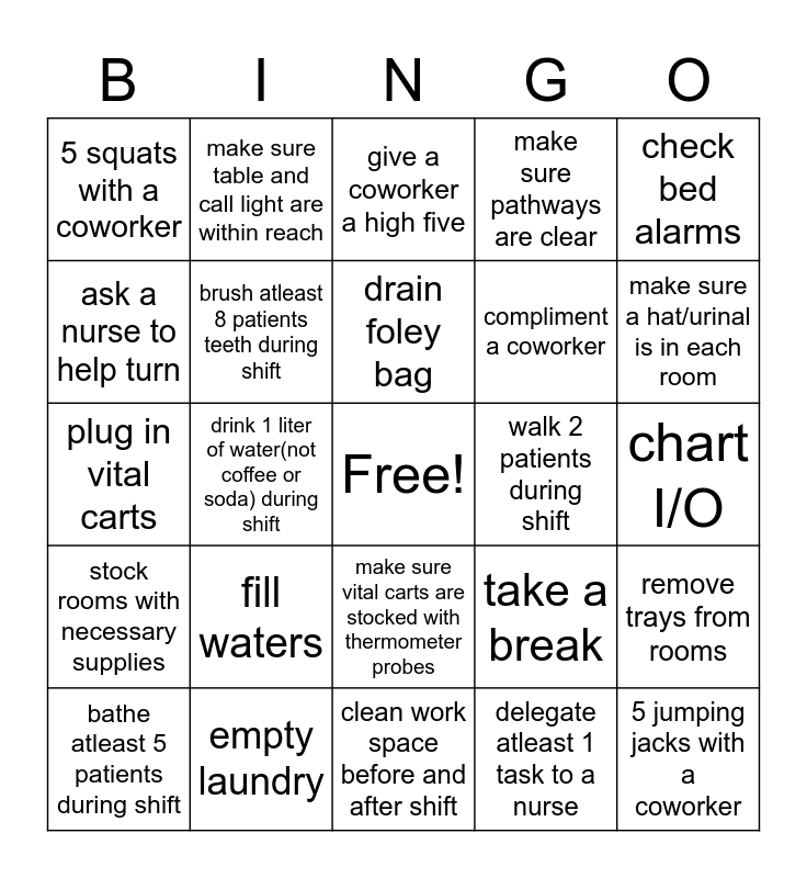 This bingo card has a free space and 24 words: fill waters, empty laundry, drain foley bag, bathe atleast 5 patients during shift, check bed alarms, 5 squats with a coworker, ask a nurse to help turn, make sure table and call light are within reach, walk 2 patients during shift, make sure vital carts are stocked with thermometer probes, compliment a coworker, plug in vital carts, take a break, remove trays from rooms, brush atleast 8 patients teeth during shift, delegate atleast 1 task to a nurse, chart I/O, give a coworker a high five, make sure a hat/urinal is in each room, drink 1 liter of water(not coffee or soda) during shift, 5 jumping jacks with a coworker, stock rooms with necessary supplies, make sure pathways are clear and clean work space before and after shift.