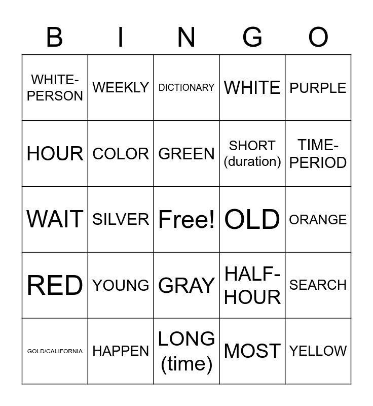 This bingo card has a free space and 39 words: BLACK, BLUE, BROWN, COLOR, GOLD/CALIFORNIA, GRAY, GREEN, PINK, PURPLE, RED, SILVER, WHITE, YELLOW, ORANGE, OLD, YOUNG, SELF, WHITE-PERSON, DAY, HALF-HOUR, HOUR, LONG (time), SHORT (duration), TIME-PERIOD, ALL-DAY, ANNUAL, FROM-TIME-TO-TIME, MONTHLY, WEEKEND, WEEKLY, ART, DRAW, DICTIONARY, HAPPEN, MOST, PAGE, SEARCH, WAIT and WHEN.