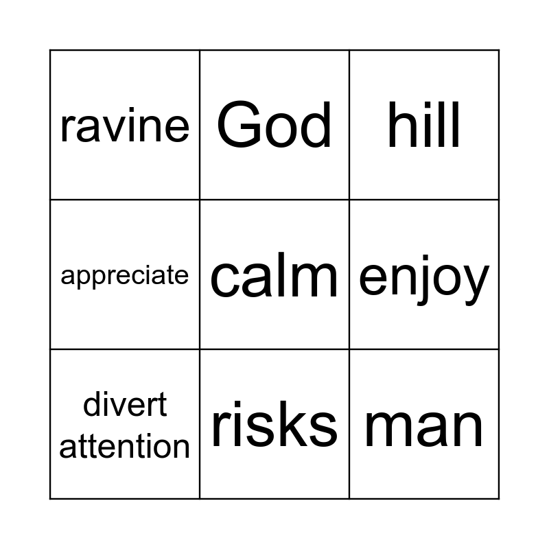 This bingo card has 12 words: safe, man, calm, enjoy, God, hill, risks, spoil, ravine, appreciate, divert attention and endeavour.