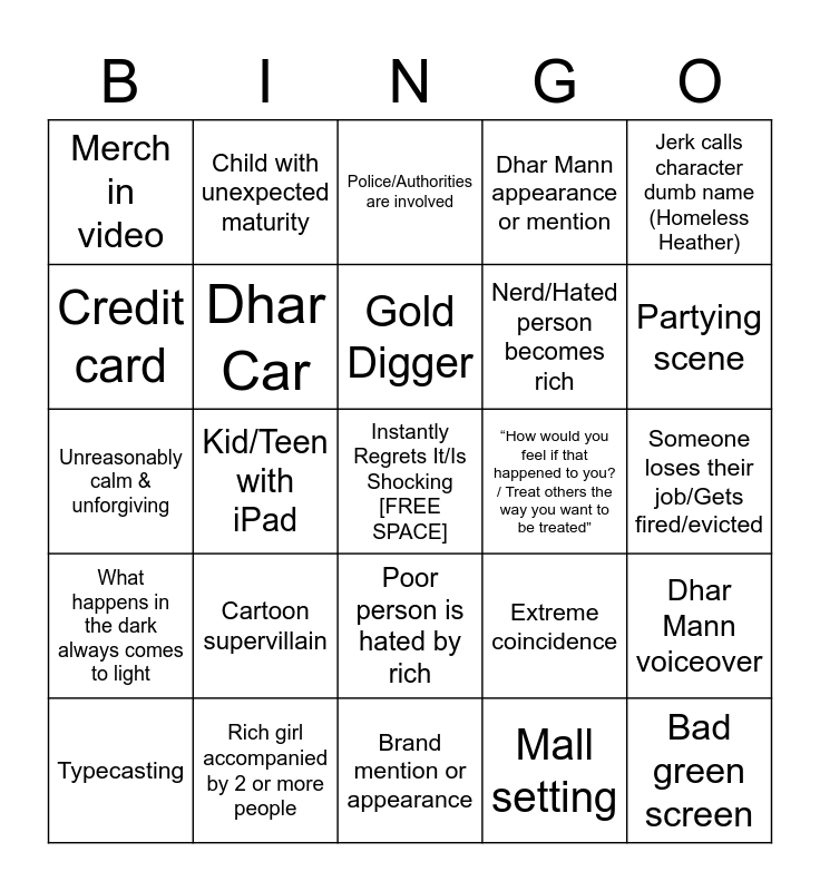 This bingo card has a free space and 50 words: Apartment setting, Bad green screen, Bad props, Brand mention or appearance, Cartoon supervillain, Character that is a stereotype, Child with unexpected maturity, Clearly in the wrong, person has an attitude, Credit card, Creep behavior, Dhar Car, Dhar Mann appearance or mention, Dhar Mann voiceover, Extreme coincidence, Flashback, Faking something or cheating for one’s goal or desires, Gold Digger, “How would you feel if that happened to you? / Treat others the way you want to be treated”, Inappropriate music, Jerk calls character dumb name (Homeless Heather), Kid/Teen with iPad, Mall setting, Merch in video, Nerd/Hated person becomes rich, Oblivious parents with demon child, Parking lot confrontation, Partying scene, Person in charge of something revealed (I’m the manager), Police/Authorities are involved, Poor person is hated by rich, Problematic lesson, Racism, Random celebrity appearance, Random dramatic and emotional monologue, Rich girl accompanied by 2 or more people, Roblox in video, School setting, Secretly rich, Sexism, Someone loses their job/Gets fired/evicted, Spaghetti, Successful person gets a boyfriend/girlfriend, Time skip, Trying to be hip and relevant, Typecasting, Unreasonably calm & unforgiving, Using a famous quote unattributable to anyone, Visible errors, What happens in the dark always comes to light and “You see/ "So you see”.