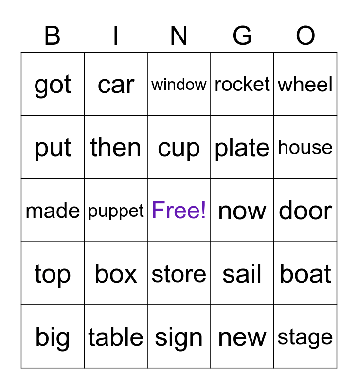 This bingo card has a free space and 24 words: box, table, cup, big, wheel, got, put, car, now, store, plate, made, sail, boat, then, new, door, window, house, puppet, stage, top, rocket and sign.