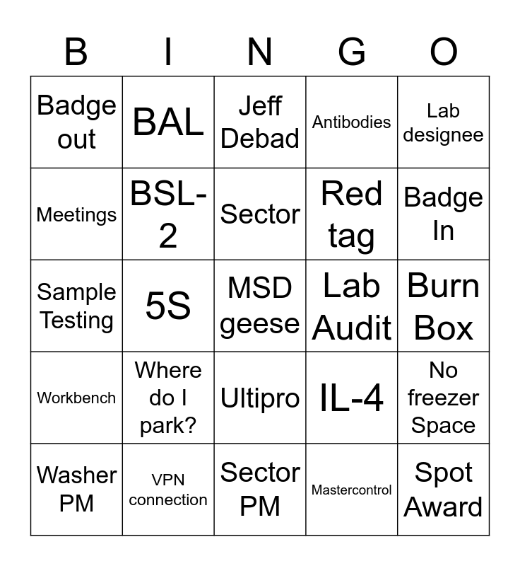 This bingo card has 36 words: Pipette, INF-A, Calibration, BSL-2, IL-4, Workbench, Sector, Freezer Defrost, Lab designee, PBS, 5S, Antibodies, COVID, Lab Audit, Badge In, Badge out, Spot Award, Where do I park?, MSD geese, Jeff Debad, Burn Box, No freezer Space, VPN connection, Washer PM, Sector PM, BAL, Sample Testing, Protocol, Red tag, Meetings, Lab notebook, Happy hour, Mastercontrol, Ultipro, ERP and This meeting should have been an email.