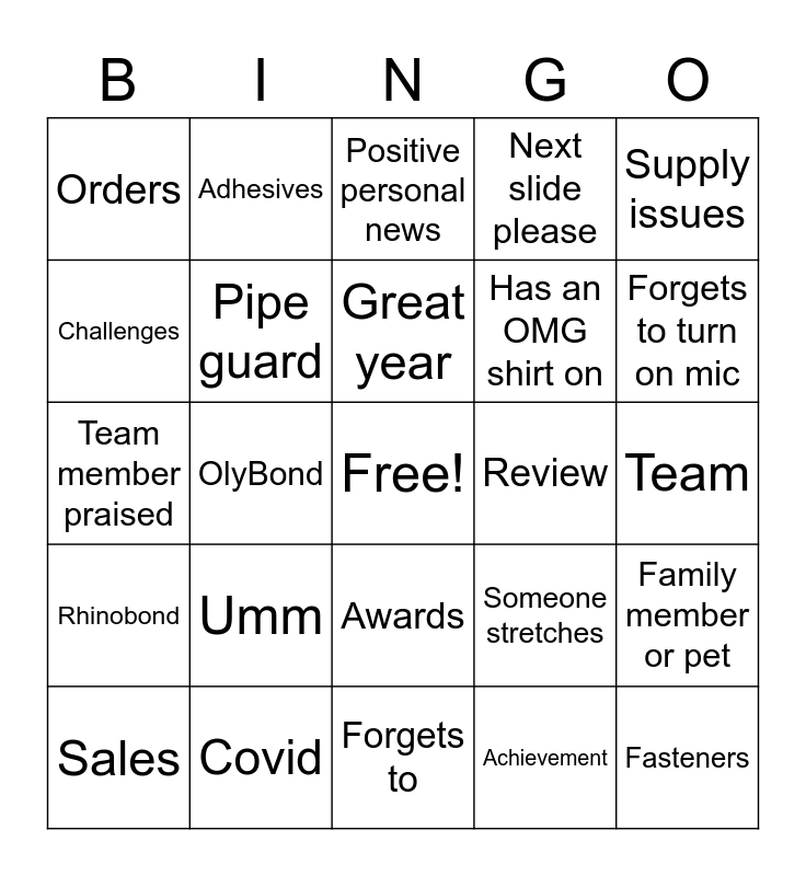 This bingo card has a free space and 24 words: Umm, Covid, Great year, Sales, Supply issues, Orders, Challenges, Adhesives, Review, Awards, Has an OMG shirt on, Team member praised, Someone stretches, Family member or pet, Pipe guard, Achievement, Team, Positive personal news, Forgets to turn on mic, OlyBond, Fasteners, Rhinobond, Next slide please and Forgets to.