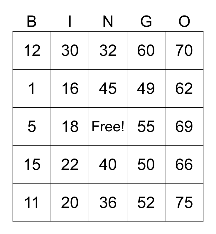 This bingo card has a free space and 24 words: 11, 22, 45, 52, 70, 12, 30, 32, 55, 69, 5, 16, 50, 66, 1, 20, 36, 60, 62, 15, 18, 40, 49 and 75.
