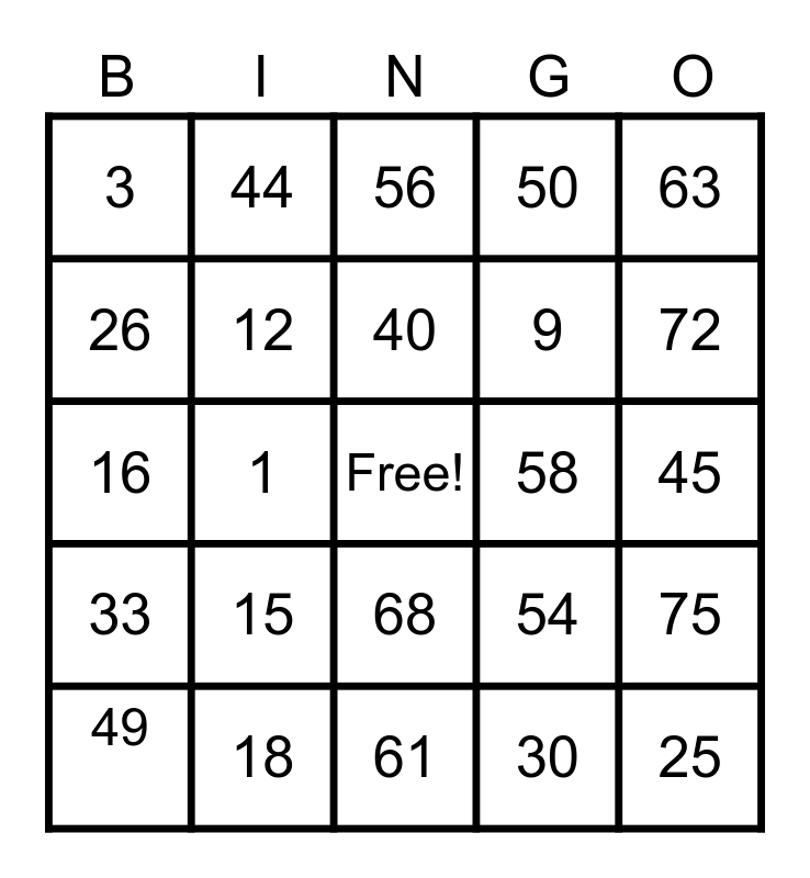 This bingo card has a free space and 24 words: 15, 18, 40, 49, 63, 3, 26, 44, 58, 68, 9, 16, 54, 75, 12, 30, 45, 56, 72, 1, 25, 33, 50 and 61.