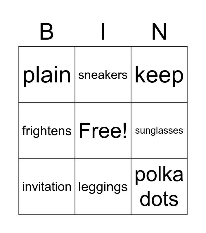 This bingo card has a free space and 26 words: pockets, comfortable, leggings, stripes, polka dots, plain, sunglasses, sneakers, bracelets, mine, his, hers, theirs, ours, match, hurts, frightens, weaker, keep, show, helmet, blanket, towel, scarf, invitation and jacket.