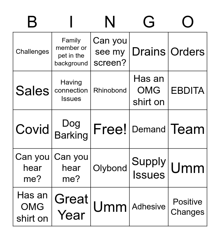 This bingo card has a free space and 24 words: Can you hear me?, Great Year, Rhinobond, Has an OMG shirt on, Orders, Challenges, Sales, Family member or pet in the background, Demand, Olybond, Has an OMG shirt on, Covid, Supply Issues, Umm, Having connection Issues, Adhesive, Team, Can you see my screen?, EBDITA, Dog Barking, Positive Changes, Can you hear me?, Drains and Umm.