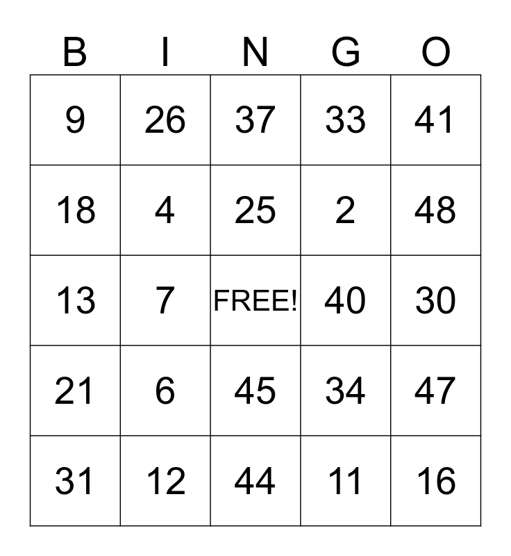 This bingo card has a free space and 24 words: 6, 12, 25, 31, 41, 9, 18, 26, 40, 45, 2, 13, 34, 47, 4, 11, 30, 37, 48, 7, 16, 21, 33 and 44.