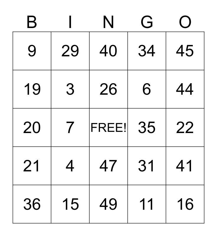 This bingo card has a free space and 24 words: 4, 15, 26, 36, 45, 9, 19, 29, 35, 47, 6, 20, 31, 41, 3, 11, 22, 40, 44, 7, 16, 21, 34 and 49.