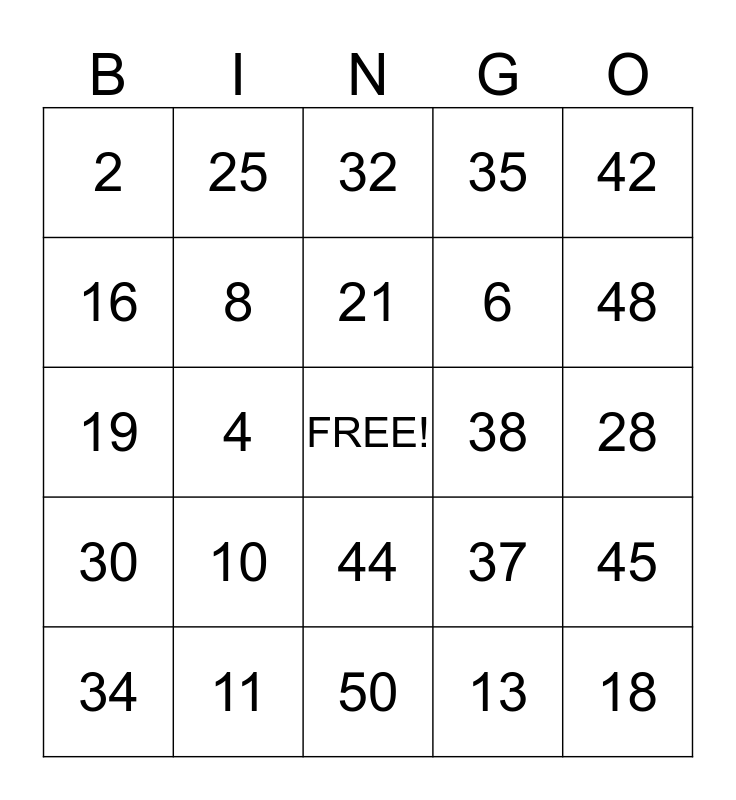 This bingo card has a free space and 24 words: 10, 11, 21, 34, 42, 2, 16, 25, 38, 44, 6, 19, 37, 45, 8, 13, 28, 32, 48, 4, 18, 30, 35 and 50.