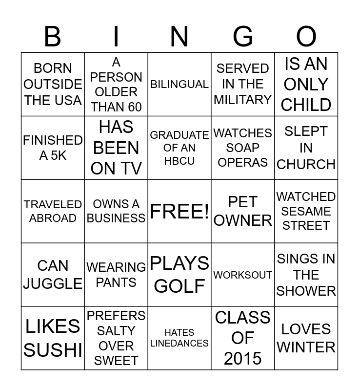 This bingo card has a free space and 24 words: WEARING PANTS, PREFERS SALTY OVER SWEET, GRADUATE OF AN HBCU, LIKES SUSHI, IS AN ONLY CHILD, BORN OUTSIDE THE USA, FINISHED A 5K, A PERSON OLDER THAN 60, PET OWNER, PLAYS GOLF, WATCHES SOAP OPERAS, TRAVELED ABROAD, WORKSOUT, SINGS IN THE SHOWER, HAS BEEN ON TV, CLASS OF 2015, WATCHED SESAME STREET, BILINGUAL, SLEPT IN CHURCH, OWNS A BUSINESS, LOVES WINTER, CAN JUGGLE, SERVED IN THE MILITARY and HATES LINEDANCES.