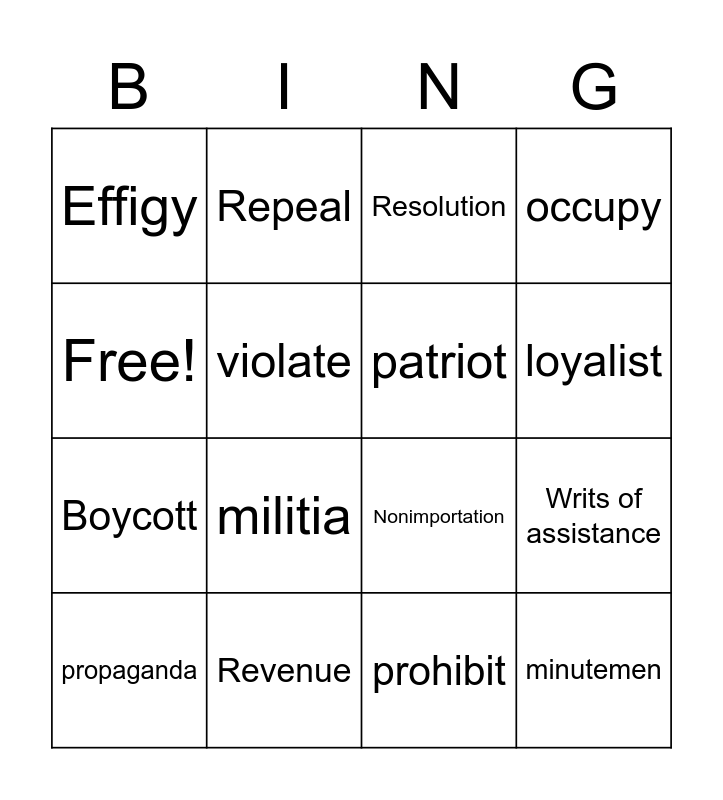 This bingo card has 16 words: Revenue, Writs of assistance, Resolution, Effigy, Boycott, Repeal, Nonimportation, prohibit, Free!, violate, propaganda, occupy, militia, loyalist, patriot and minutemen.