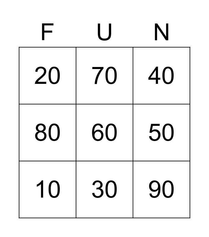 This bingo card has 9 words: 10, 40, 70, 80, 20, 50, 60, 90 and 30.
