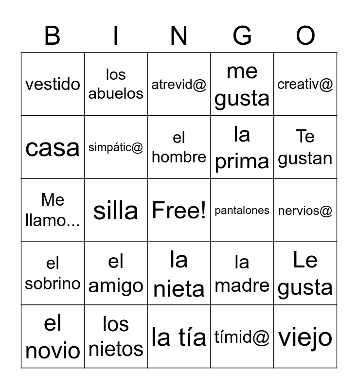 This bingo card has a free space and 93 words: enojad@, atlétic@, la tía, mal, rubi@, aburrid@, el chico, el novio, el hermano, moren@, el gato, los hijos, los novios, la prima, el primo, creativ@, atrevid@, la hija, el perro, excelente, emocionad@, gord@, el padre, la amiga, el amigo, simpátic@, los amigos, gracioso/graciosa, la chica, la novia, los nietos, la nieta, el abuelo, la abuela, los abuelos, el nieto, guapo, content@, el hombre, la madre, Me llamo..., el sobrino, nervios@, la sobrina, viejo, los padres, bonita, pelirroj@, triste, seri@, baj@, tímid@, los hermanos, enferm@, la hermana, el hijo, apartamento, tina, cama, dormitorio, silla, comedor, lavaplatos, puerta, planta baja, suelo, refrigerador, horno, casa, garaje, cocina, sala, escalera, me gusta, Me gustan, Te gusta, Te gustan, Le gusta, Nos gusta, Les gusta, camisa, zapatos, pantalones, vestido, blusa, puedo, puedes, podemos, quiero, quieres, queremos, entiendo and entendemos.