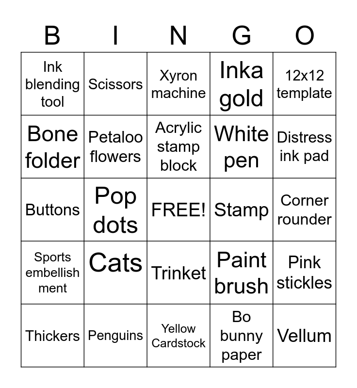 This bingo card has a free space and 24 words: Cats, Penguins, Acrylic stamp block, Thickers, 12x12 template, Ink blending tool, Bone folder, Scissors, Stamp, Trinket, White pen, Buttons, Paint brush, Pink stickles, Petaloo flowers, Bo bunny paper, Corner rounder, Xyron machine, Distress ink pad, Pop dots, Vellum, Sports embellish ment, Inka gold and Yellow Cardstock.