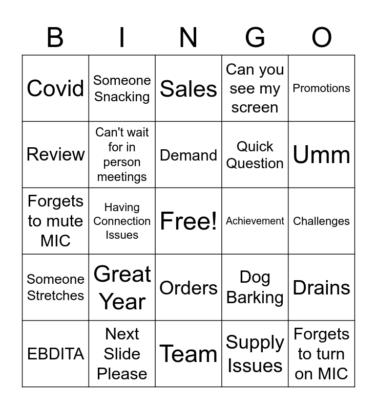 This bingo card has a free space and 24 words: Great Year, Next Slide Please, Demand, EBDITA, Promotions, Covid, Review, Someone Snacking, Achievement, Orders, Quick Question, Forgets to mute MIC, Dog Barking, Drains, Can't wait for in person meetings, Supply Issues, Challenges, Sales, Umm, Having Connection Issues, Forgets to turn on MIC, Someone Stretches, Can you see my screen and Team.