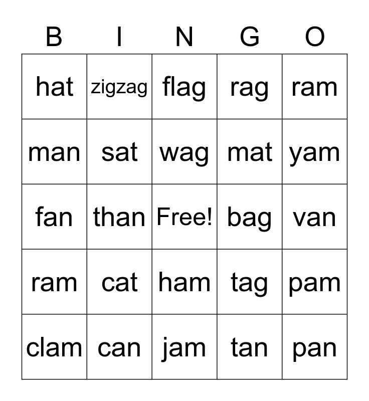 This bingo card has a free space and 24 words: cat, can, wag, clam, ram, hat, man, zigzag, bag, ham, mat, fan, tag, pam, sat, tan, van, flag, yam, than, pan, ram, rag and jam.